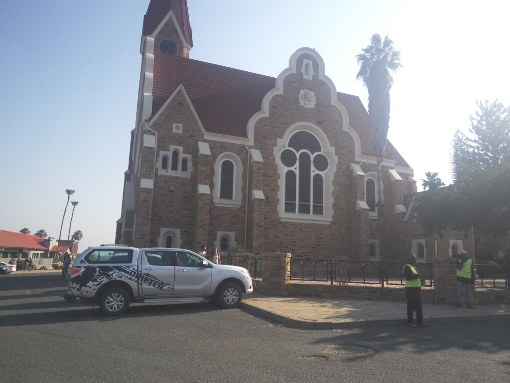 Først så vi Kristuskirken. Oprindeligt kaldet Fredskirken fordi den blev grundlagt i 1907 efter krigen mellem tyskerne og Herero- og Namafolket. Der var dog lukket så det blev kun til beskuelse udefra.