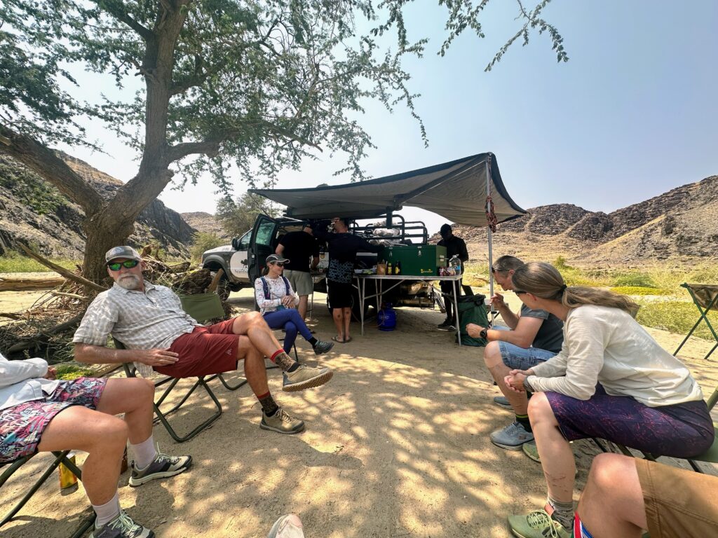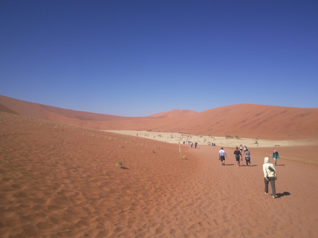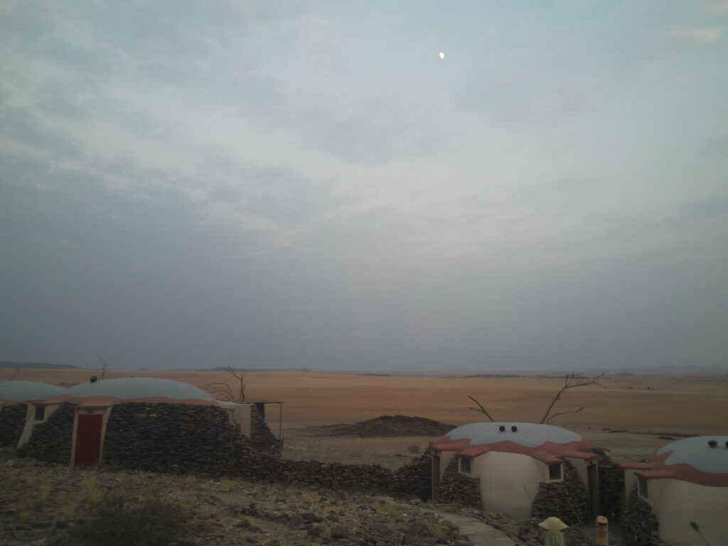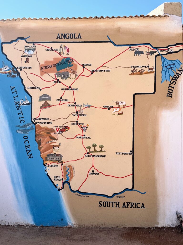 Namibia er 22 gange større end Danmark, men der bor kun ca 2,2 millioner mennesker hvoraf ca 400.000 bor i hovedstaden Windhoek (som betyder vindkrogen eller det forblæste hjørne). Windhoek er omgivet af bjerge så derfor ligger den internationale lufthavn ca 45 km væk.