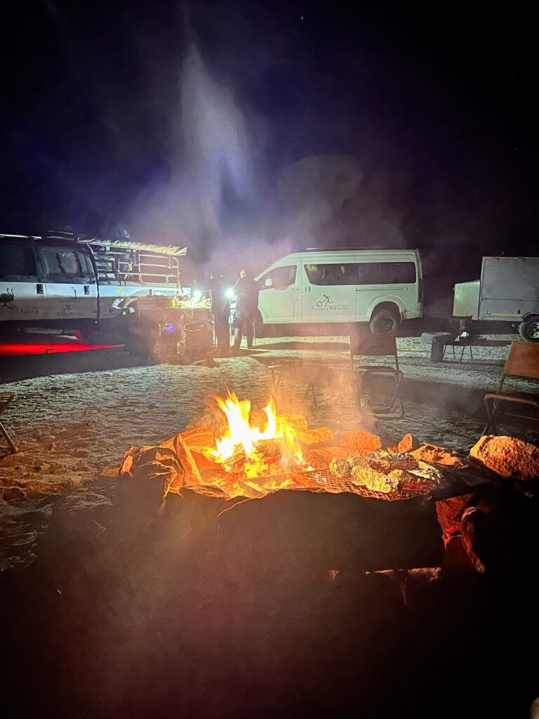 Da sulten meldte sig tog vi igen en slags Uber til en anden restaurant som hotelreceptionisten anbefalede. Restauranten er skabt af en indfødt tysker og man følte næsten at Oktoberfesten kunne starte når som helst. De serverede bl.a. wienerschnitzel og Jægermeister. Det er et sted for kødelskere! Man kunne bl.a. få farsbrød af giraf men det kunne jeg altså ikke få mig selv til at bestille. Vi sad ved langborde og spiste, og vi faldt i snak med nogle andre gæster som kom fra det sydlige Tyskland og som qua deres pensionisttilværelse var på en 9-måneders Afrika-tur i egen bil. Meget interessant at høre om. De er de eneste som vi kender til, der også har været i Kazakhstan.