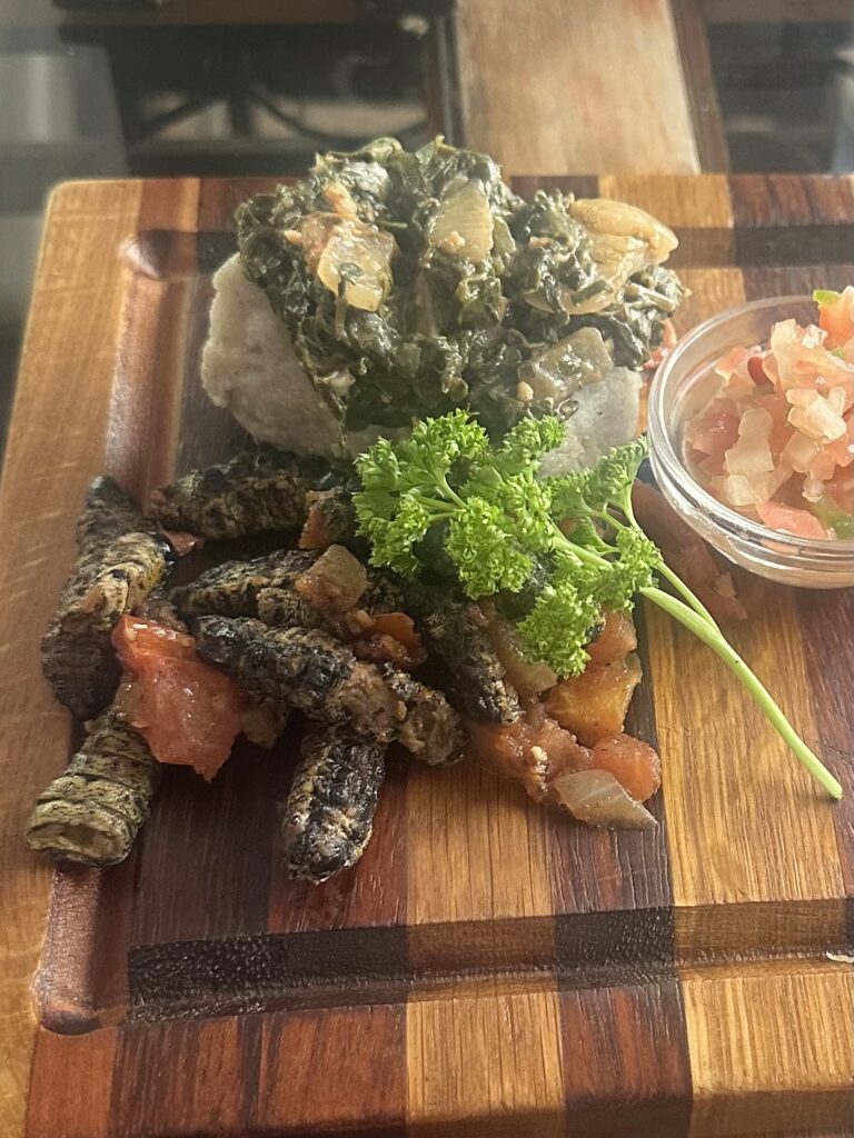 Vores guide havde bestilt en delikatesse i restauranten og det var larverne fra Mopanetræet der var blevet tilberedt med lidt salsa og spinatpolenta. Virkelig klamt – det skulle jeg ikke bede om, men de få der smagte på larverne sagde det var ok. Lidt mærkelig tekstur og derfor døbte de retten “Kalahari- kalamari”