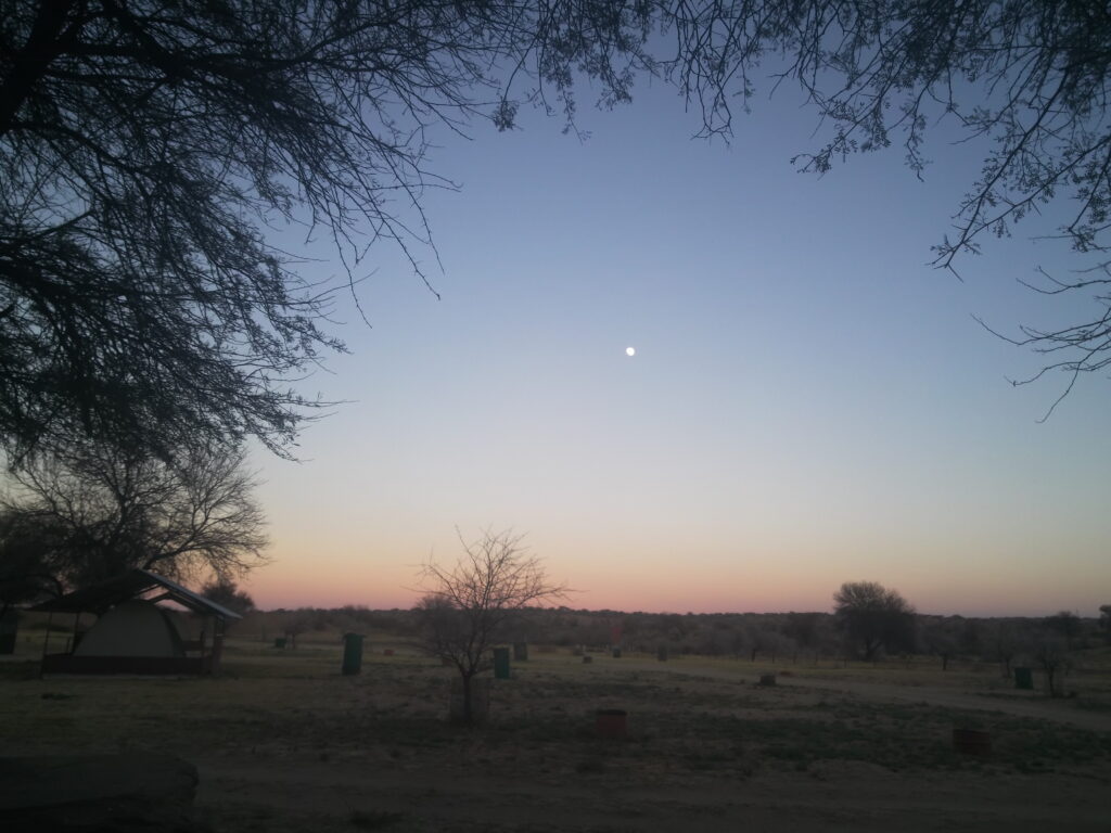Vores camp ligger i et 40.000 hektar stort privat vildt reservat. De vilde dyr går omkring som de har lyst til. Så man skal selv være lidt opmærksom. Stedet er meget populært da den ligger relativt tæt på “Big Daddy” som er den største sandklit i verden. Vi blev kørt 4 km hen til et kæmpe hotel for at spise aftensmad. Der skal vi også spise morgenmad i morgen tidlig; Kl 07.00!
