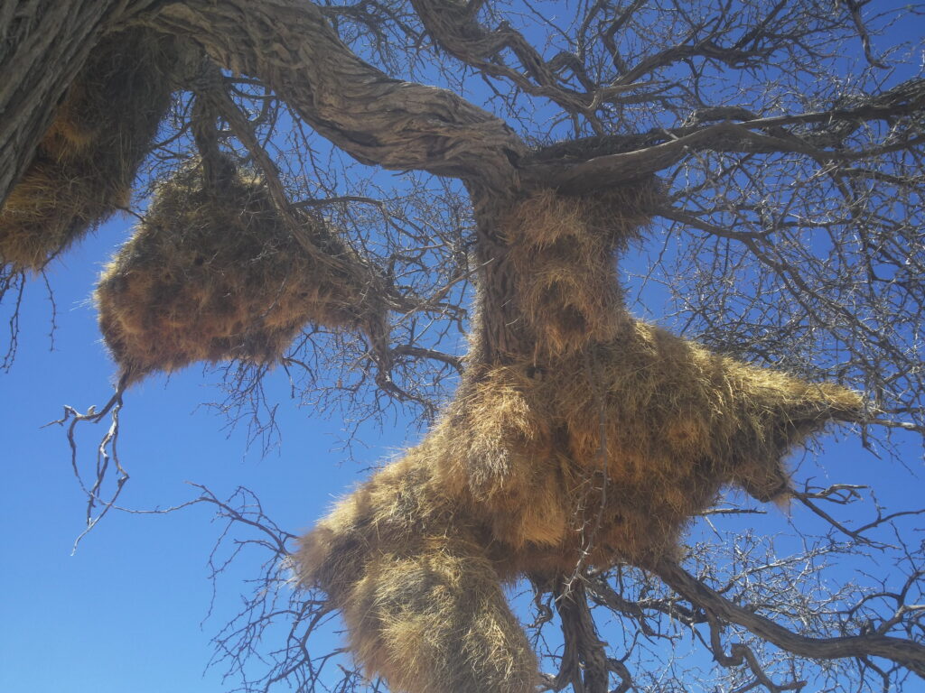 Vi stoppede for at se et kæmpe redekompleks bygget af sociale væverfugle. Disse fuglekollektiver kan både blive ret stor og ret gamle. Ungerne bliver i træet og bygger nye reder. Nogle gange bliver kollektivet revet i stykker af vinden, men så starter fuglene bare forfra.