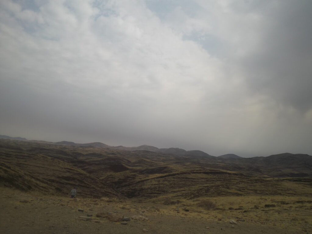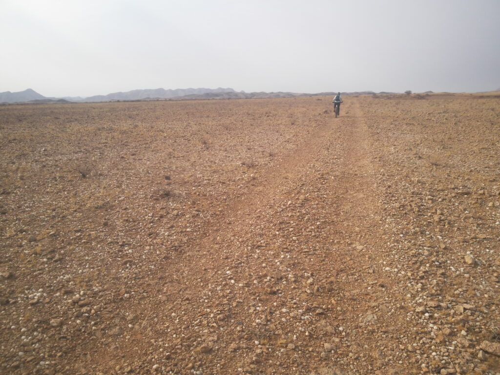 Morgenmad kl. 07.00 iført cykeltøj. 10km hen til en anden kløft, Youb canyon og tilbage samme vej. Græsset er svagt grønt. Der er faldet regn for første gang i 10 år.