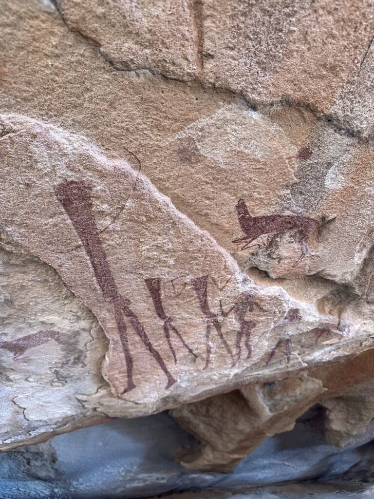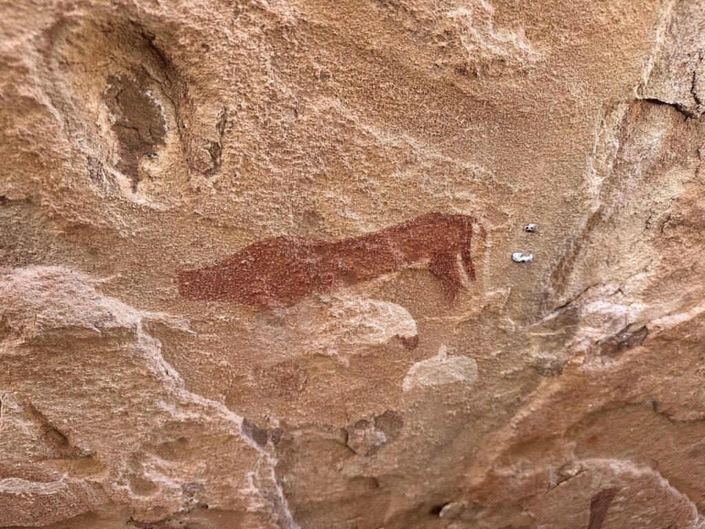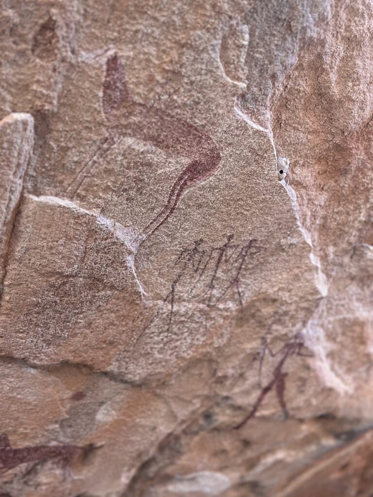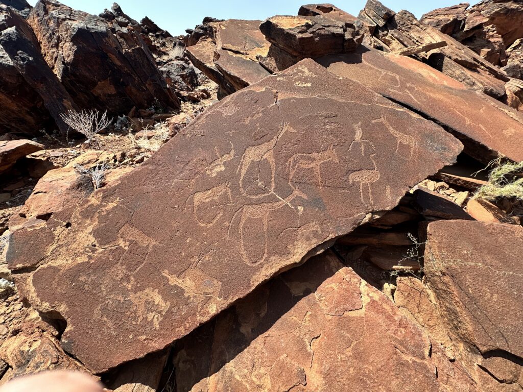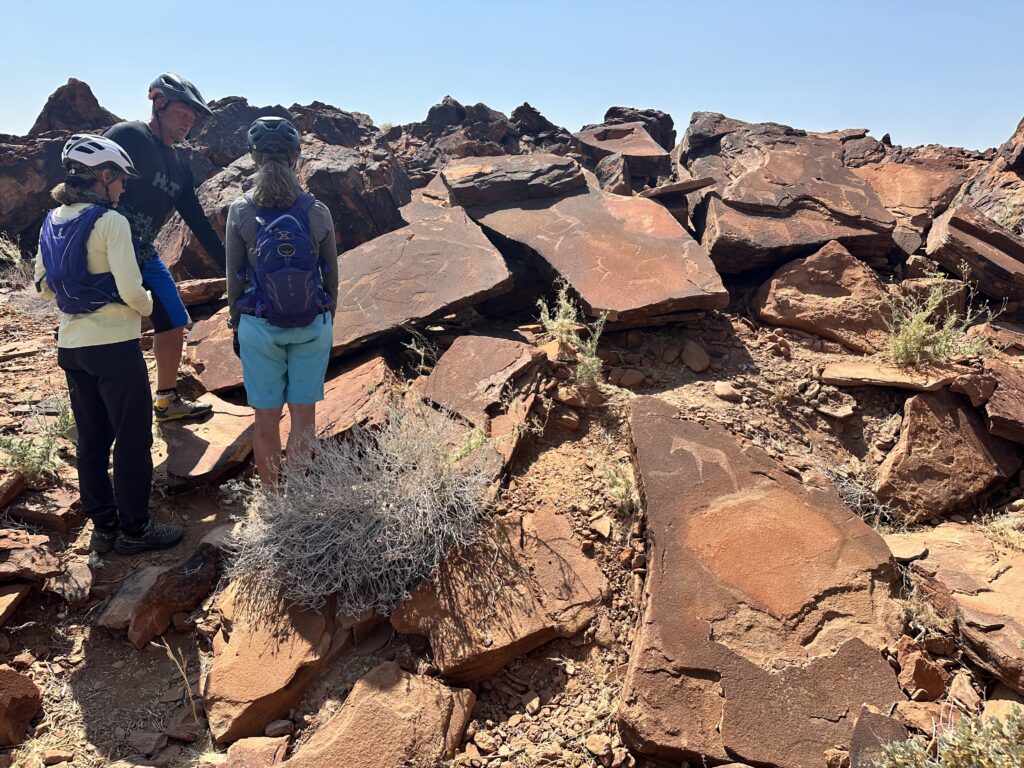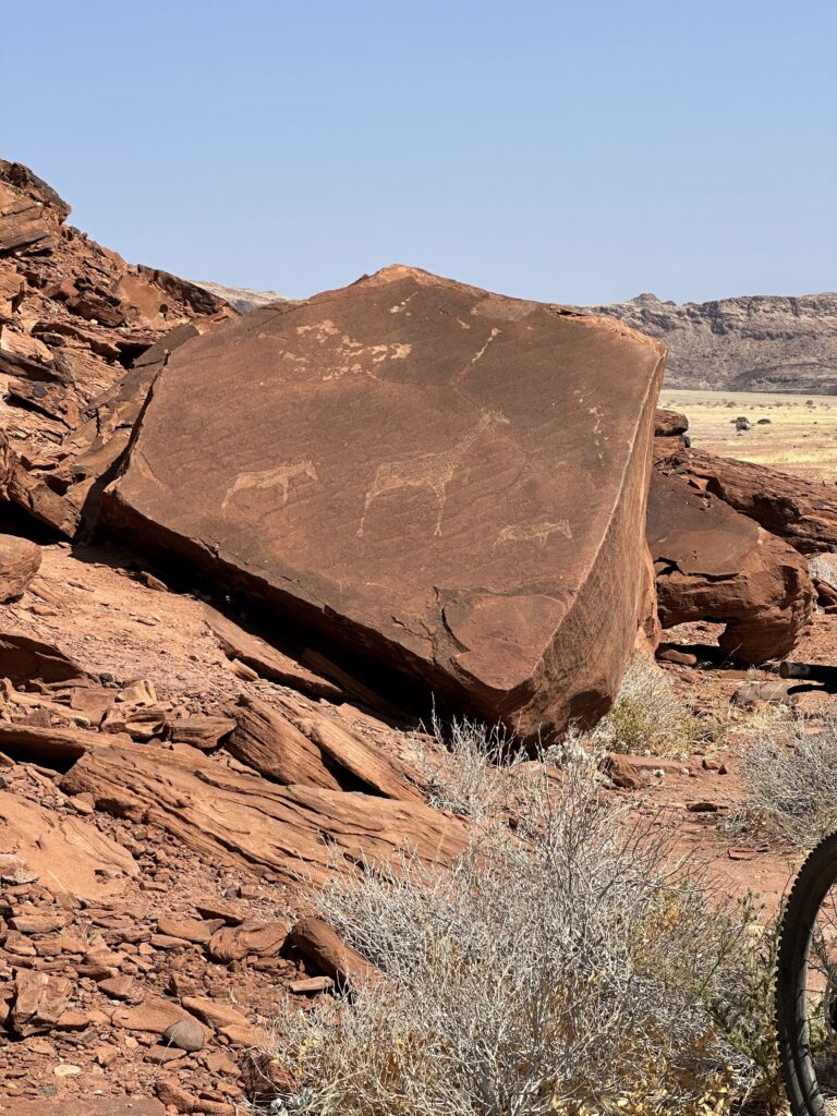 Sidste dag på cykel inden vi når tilbage til Windhoek. Ca 50km! Der var en masse af det der kviksand som er pivhårdt at cykle i samt store og større sten. Vi forlader Damaraland og skal cykle til Brackenzahn til den sidste nat ude i det fri. Der var nogle store blankslidte lavasten rundt omkring. Elefanter og næsehorn bruger disse sten til at gnubbe maven og bagdelen på. For at give sig selv en lille massage. Vi stoppede og lagde cyklerne ved en klippeformation som vi gik opad. Her kunne vi se nogle andre og mindre berømte hulemalerier. Disse malerier har fungeret som en slags opslagstavler og kommunikation nomadefolkene imellem. Hovedet på det tegnede dyr vender i den retning hvor flokken blev opdaget. Smart!